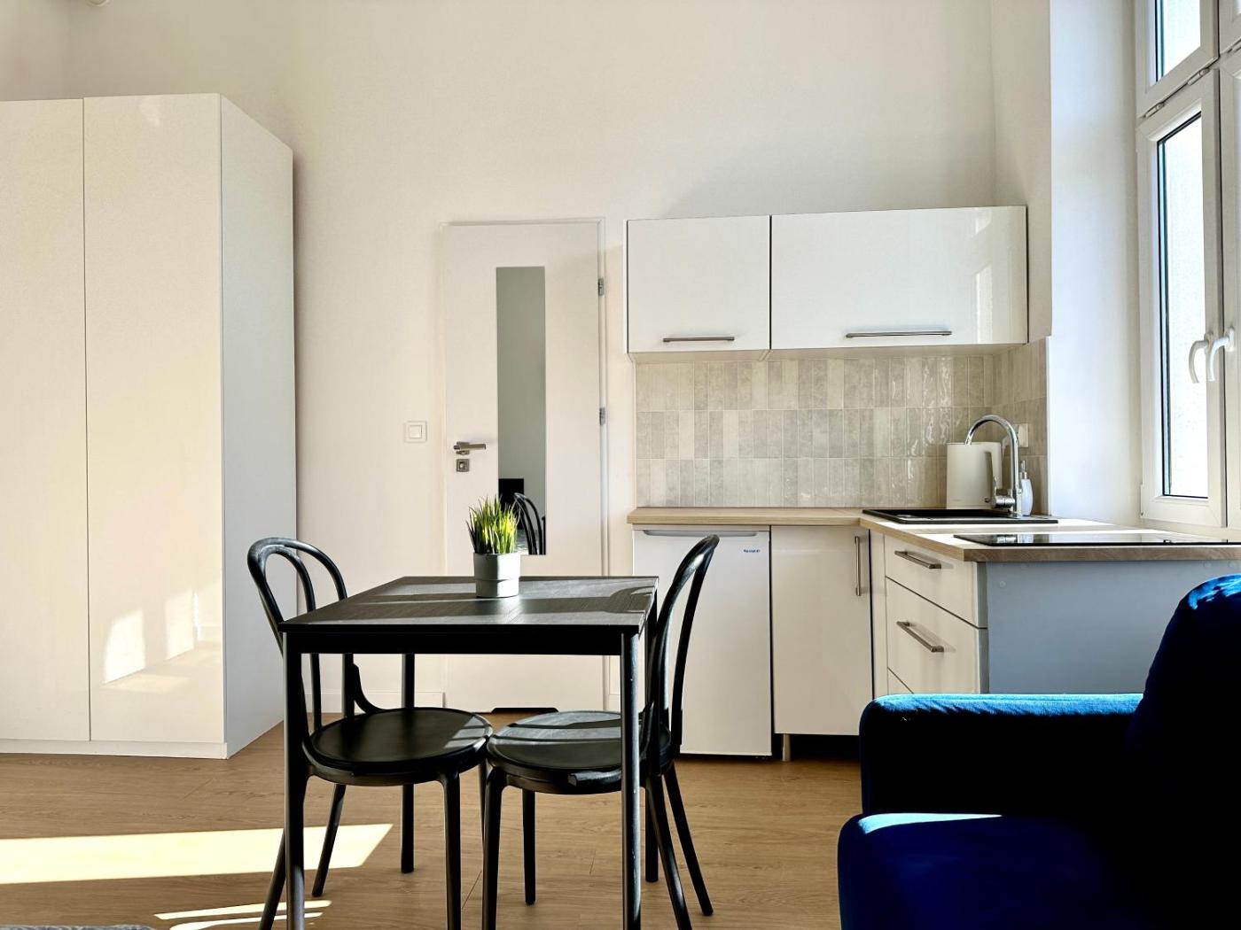 Studio. In the kitchenette, guests will find a stovetop, a refrigerator, kitchenware and an electric kettle. The studio offers a washing machine and a dining area, as well as a private bathroom boasting a shower. The unit has 2 beds. Studio - 4 osobowy. Powierzchnia pokoju ok.: 23 mkw.